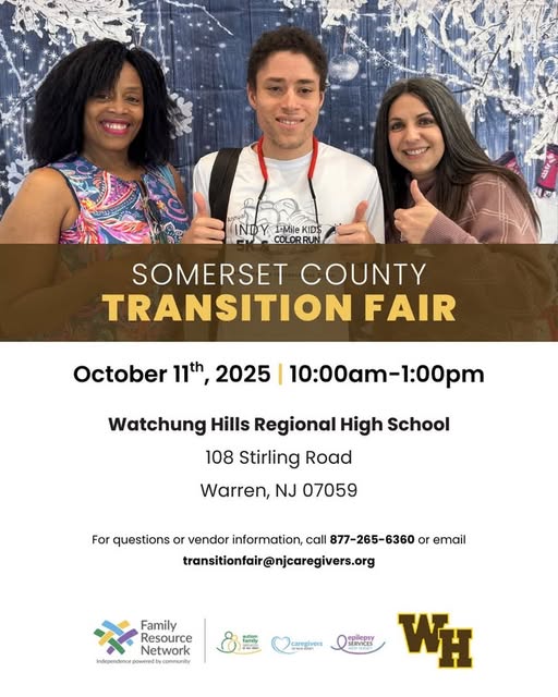 Reminder: Somerset County Transition Fair This Saturday! Saturday, October 11, 2025 10:00am – 1:00pm Watchung Hills Regional High School, Warren, NJ Do you have a high school student with an intellectual or developmental disability who will need support after graduation? This event will help families: - Learn about the transition from children’s services to the Division of Developmental Disabilities (DDD) - Understand the role of Support Coordination - Connect with local service providers in Somerset County Register today: https://bit.ly/4mWxU7b Pre-registration is encouraged. Hosted by Watchung Hills Regional High School in collaboration with Caregivers of NJ. (fb)
