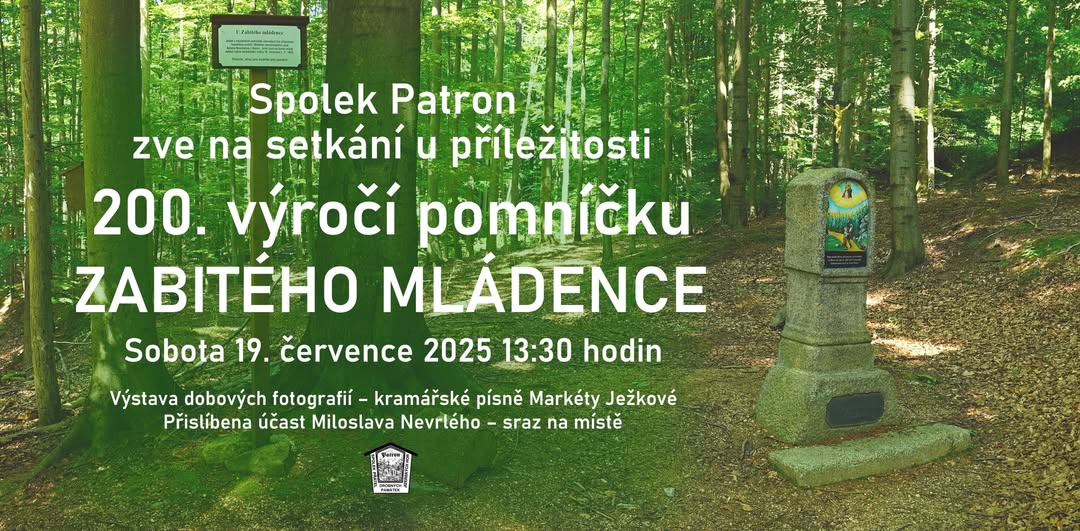 Zveme k setkání u pomníčku Zabitého mládence V letošním roce vzpomínáme 200. výročí nešťastné události, k níž došlo 18. července 1825 poblíž Staré poutní cesty do Hejnic. Teprve šestnáctiletý učeň Anton Neumann se zde stal obětí zákeřného vraha, což připomíná jeden z nejstarších a nejhezčích jizerskohorských pomníčků s doloženým příběhem. Spolek Patron připravuje při této příležitosti na sobotu 19. července 2025 neformální vzpomínkové setkání přátel a milovníků Jizerských hor a drobných památek. Účastníci se sejdou u pomníčku Zabitého mládence ve 13:30 hodin, kde bude připravena výstavka fotografií s námětem proměn pomníčku v průběhu časů. Vůbec poprvé zde zazní kramářská píseň s motivem události v podání Markéty Ježkové a jejích přátel. Získat bude možné i jedinečnou pamětní pohlednici, vydanou Spolkem Patron k tomuto výročí. Účast přislíbil Miloslav Nevrlý, jenž zajistil opravu obrázku už před 60 lety. Byl to jeho první pomníček, o jehož opravu se v Jizerských horách zasloužil, a jeden z prvních poznaných. (fb)