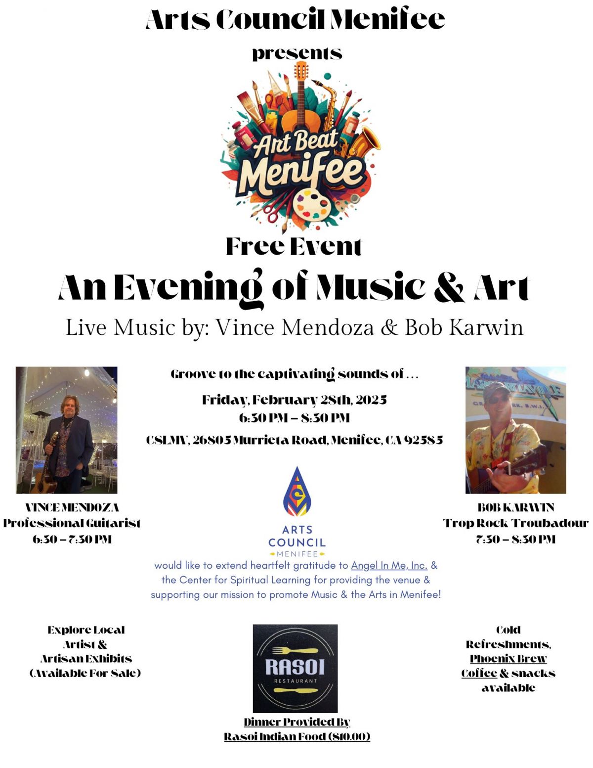 Bringing the Arts to Menifee and Local Artists to the Public Get to Know Our Sponsors Home Events Artist Spotlight Classes Support the Arts Contact Us Trustees Only More The 4th Friday of every month 630 830 pmA FREE funfilled evening of live music and art. SEE MORE THE ARTS COUNCIL MENIFEE39S PURPOSE IS TO PROMOTE THE ARTSThis body is a nonprofit cultural and educational agency to support encourage coordinate and promote highquality activities and programs for the arts in the City of Menifee and surrounding areas. It fosters greater understanding and appreciation by both the children and adults for the fine applied performing and culinary arts. OUR MOTTOBringing the Arts to Menifee and Local Artists to the Public.