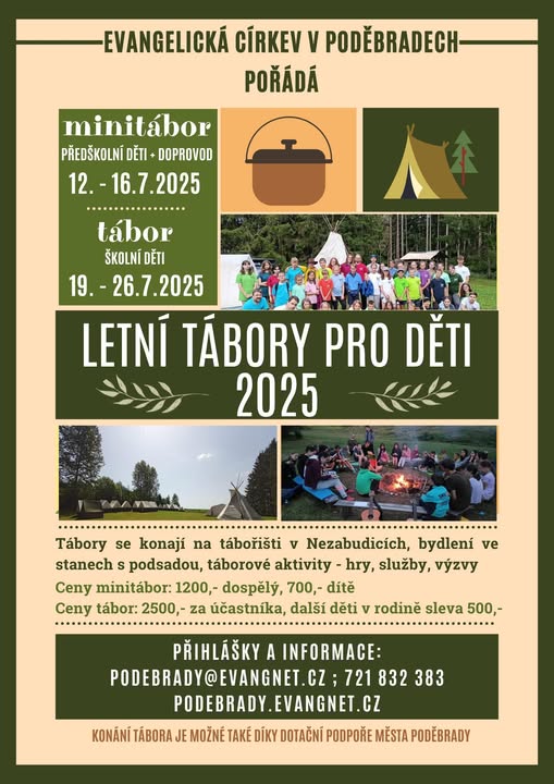 I letos pořádáme letní tábory, přihlášky na tábor i minitábor naleznete na našem webu - jsou letos online https://podebrady.evangnet.cz/tabor-2025 resp. https://podebrady.evangnet.cz/minitabor-2025 (fb)