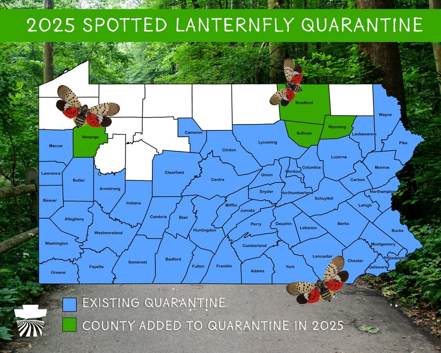 Unfortuntately, the Spotted Lanternfly has spread into three of our five counties - Bradford, Sullivan, and Wyoming are now listed in the quaratine zone. Remember to keep an eye out for this pest! (fb)