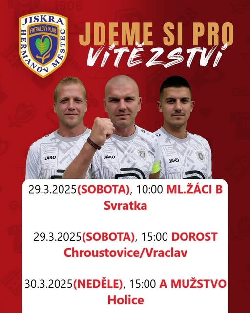 Fotbalová pozvánka na víkend: ***sobota 29.3 - žáci hrají od 9:30 hodin v Hlinsku - mladší žáky B čeká od 10 hodin domácí utkání se Svratkou - dorost hostí od 15 hodin Chroustovice/Vraclav ***neděle 30.3. - Benfika nastoupí od 15 hodin v Nasavrkách - A mužstvo čeká od 15 hodin domácí zápas s Holicemi (fb)