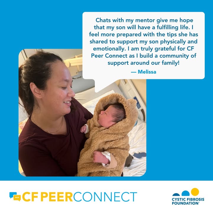 Upon learning of her newborn son’s cystic fibrosis diagnosis at 2 weeks old, Melissa wanted to find a balance between doing research and protecting her mental health. She shared these challenges with her CF care center social worker, who recommended CF Peer Connect to connect with another first-time mom. After being matched, they’ve discussed the impacts of CF, caring for a newborn, and the joys and lessons of raising a baby. Whether you’re experiencing a new CF diagnosis or just want to connect with someone who understands what you are going through, CF Peer Connect can help. Get started today: https://on.cff.org/3SkOlN0 (fb)