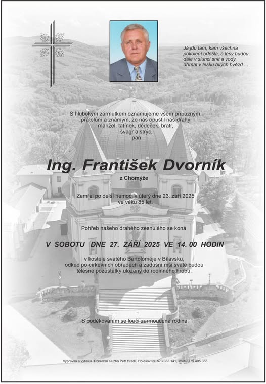 V sobotu 27. září 2025 se v bílavském kostele blízcí a přátelé naposledy rozloučili s Ing. Františkem Dvorníkem. Rodák z Chomýže, kde se narodil 9. února 1940, vystudoval geodézii a kartografii na pražské stavební fakultě ČVUT. Postupně prošel různými pozicemi v rámci katastrálního úřadu až do funkce vedoucího oddělení a pracoviště. Od roku 2004 vykonával funkci ředitele Katastrálního pracoviště Holešov Katastrálního úřadu pro Zlínský kraj. Své celoživotní vzdělání a lásku k oboru zúročil hned ve dvou publikacích, které věnoval dějinám holešovského katastrálního úřadu (2013) a obecněji dějinám zeměměřických služeb na Holešovsku a Bystřicku (2015). Svým spolufarníkům dedikoval práci "Kostel svatého Bartoloměje a farnost bílavská", která potvrdila jeho hluboký vztah k rodnému kraji pod Svatým Hostýnem. Se svými poznatky se laskavě podělil i s holešovským publikem v rámci cyklu přednášek v městské knihovně. Ochotně spolupracoval při odborných popisech vzácných historických map uložených v holešovském městském muzeu. Ve Vlastivědném kroužku vykonával funkci člena kontrolního výboru a v roce 2023 byl jmenován jeho čestným členem. S tichou vzpomínkou vděční členové kroužku! (fb)