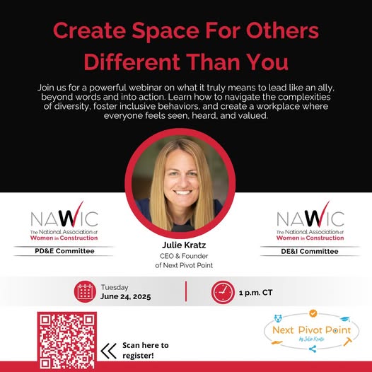 Join Julie Kratz in the webinar, Create Space For Others Different Than You. This powerful webinar explores what it truly means to support those different from ourselves. Learn how to embrace ambiguity, navigate the tension of paradox, and create a culture where all voices feel seen and valued. This session will help you move from intention to meaningful action, and foster belonging in every corner of the workplace. Register today and take the next step in inclusive leadership! https://ow.ly/6QmC50W8Awp #NAWIC #DEICommittee #ConstructionCulture (fb)