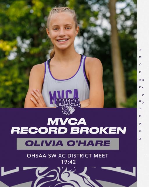 🏃♀️ Congrats to Freshman Olivia O’Hare! She ran an amazing 19:42, breaking the MVCA Girls District XC record and punching her ticket to the OHSAA Regional Meet next week at Troy HS! 🔥 #MVCALions #MVCAxc #RoadToState #RecordBreaker (fb)