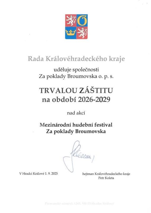 Děkujeme Královéhradecký kraj za udělení trvalé záštity festivalu Za poklady Broumovska pro roky 2026–2029. Takováto podpora nám dává motivaci pokračovat v přinášení výjimečných hudebních zážitků do našeho regionu. 💛 Těšíme se na další společné roky plné hudby, inspirace a setkávání! 🎶 (fb)