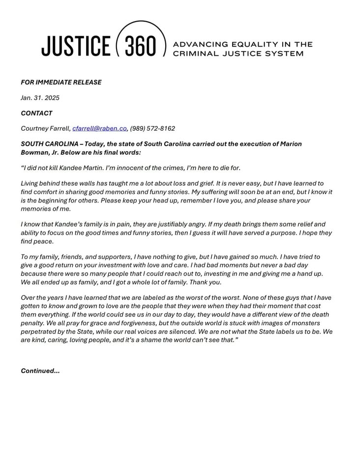 Tonight the State of South Carolina took the unprecedented step of conducting its first ever execution of a civilian by the firing squad. We are sad to witness this dark day in our state's history. All of us at Justice 360 will continue to fight for reforms in our criminal justice system and a more just future. (fb)