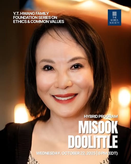 Understanding ourselves and humanity requires exploring morality, ethics, and universal values. Presented with the Y.T. Hwang Family Foundation, The Korea Society’s Series on Ethics and Common Values examines these themes through lectures and conversations with distinguished speakers. Join us Wednesday, October 22, 2025, at 6 PM (EDT) for fashion pioneer and philanthropist Misook Doolittle in conversation with Ambassador Kathleen Stephens. Register to attend in person or stream online here: https://www.koreasociety.org/arts-culture/2049-y-t-hwang-family-foundation-series-on-ethics-common-values-misook-doolittle?highlight=WyJtaXNvb2siXQ== — The Korea Society is a nonprofit, nonpartisan 501(c)(3) organization dedicated to fostering awareness, understanding, and cooperation between the people of the United States and Korea. Learn more at koreasociety.org. (fb)