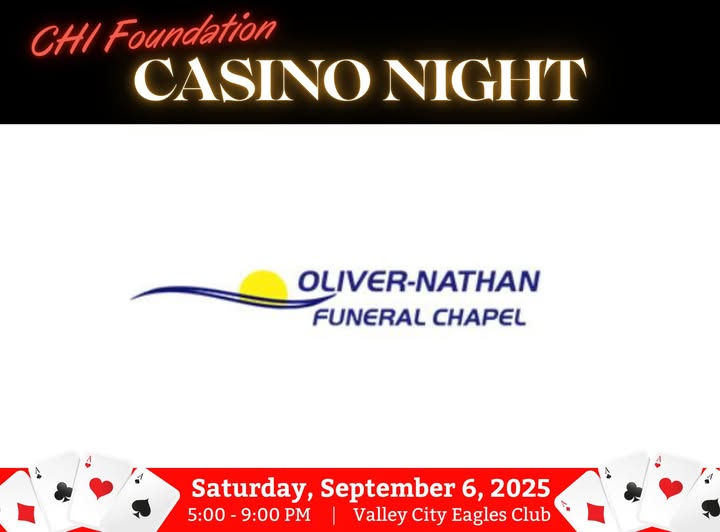 🎲 Sponsor Shout-Out! 🎲 Oliver Nathan Funeral Chapel is an official sponsor of the CHI Foundation Casino Night! Join us on September 6th at the Valley City Eagles Club. Get your tickets today at https://ow.ly/pzns50WyLpq (fb)