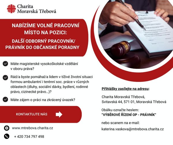 Přidej se k nám do Občanské poradny jako Další odborný pracovník/právník! 🏆✨ Společně s námi pomůžeš lidem zvládnout složité životní situace – v oblasti dluhů, exekucí, rodinného či pracovního práva. Klientům poskytujeme odborné poradenství, podporu, pomáháme se sepisováním různých druhů písemností – návrhy na oddlužení, opravné prostředky, žaloby, žádosti apod. Budeš další odbornou podporou i našim sociálním pracovníkům v týmu. Těšíme se na Tebe! 👉 Chceš vědět víc? Podívej se na náš web a pošli nám svůj životopis: https://www.mtrebova.charita.cz/typy-stranek/volna-mista/dalsi-odborny-pracovnik-pravnik-do-obcanske-poradny/ (fb)