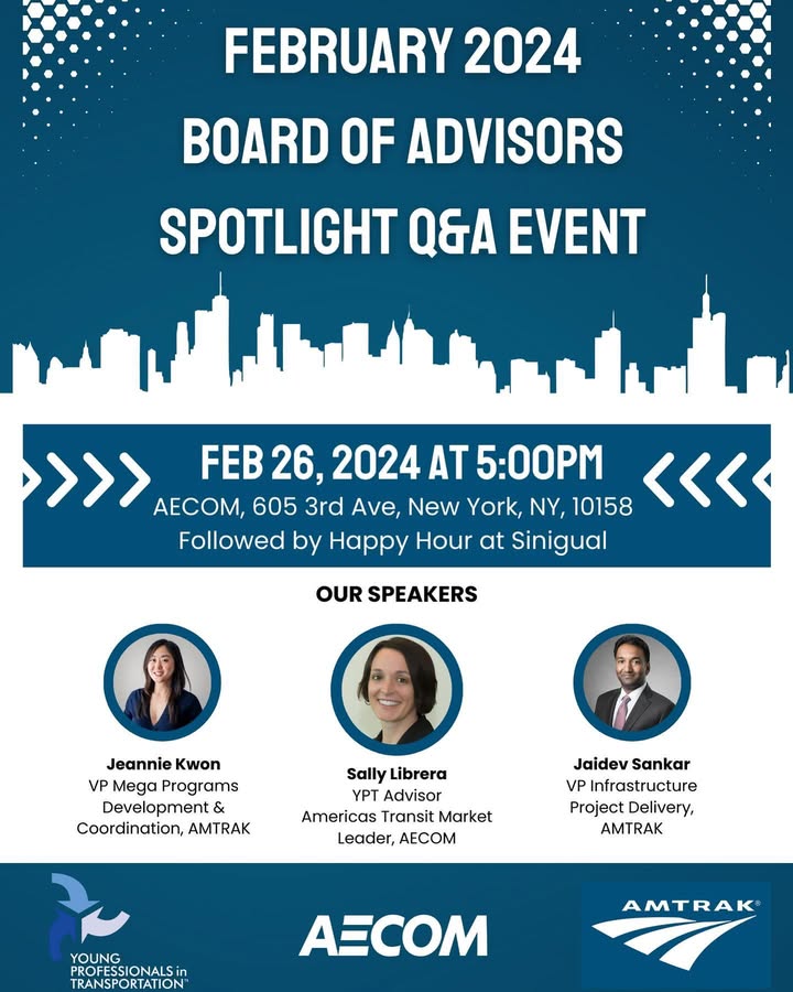 EVENT UPDATE: Our January Board of Advisors Spotlight Event has been rescheduled for Monday, February 26, 2024. Please join us for our YPT Board of Advisors spotlight event at AECOM’s NYC office, featuring our #YPTAdvisor, Sally Librera, Americas #Transit Market Leader at @aecom . The Q&A session also features Amtrak’s Jeannie Kwon, VP of Mega Programs Development & Coordination, and Jaidev Sankar , VP of #Infrastructure Project Delivery at @amtrak . We will also have a #YPT happy hour after the Q&A at Sinigual. Register here: https://lnkd.in/gbVEWMYp *Link in Bio* #WhyIYPT #YPTransportation #Transportation (fb)
