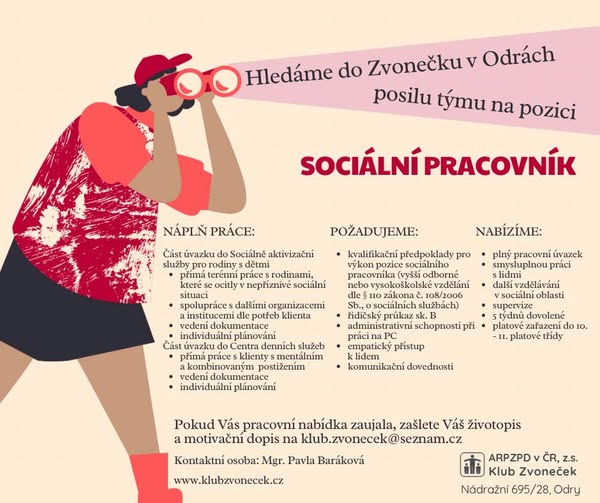 🔎 Hledáme sociálního pracovníka do Sociálně aktivizační služby pro rodiny s dětmi a Centra denních služeb na plný úvazek. Pomůžete nám jej najít? Budeme rádi za sdílení ✨ (fb)