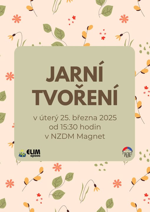 V příštím týdnu pro Vás v Nzdm Magnet opět chystáme další aktivitku a tentokrát potěšíme všechny kreativní duše! 😍 25. března přijďte na jarní tvoření nebo si jen tak pokecat, co plánujete v hezkém, slunečném počasí. 😊 #ElimOpava #NzdmMagnet (fb)