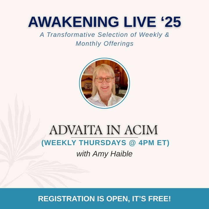 Dive into Non-Dual Teachings Join Amy Haible for Advaita in ACIM every Thursday at 4pm ET. Integrate the unity behind all experience through A Course in Miracles and Advaita Vedanta. 🔗 Registration is Open: https://www.centerforawakening.org/awakening-live-25 . . #NonDuality #AdvaitaVedanta #ACIM #SpiritualAwakening #AwakeningLive25 #AAcourseinMiracles (fb)