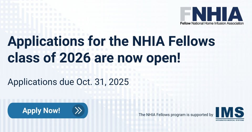 Apply to be recognized in the 2026 NHIA Fellow Class! Each year, the National Home Infusion Foundation recognizes a new class of NHIA Fellows—outstanding infusion professionals who have dedicated their time to the industry. This prestigious honor is open to professionals across all roles within home/alternate site infusion who have been in the industry for at least 7 years. The deadline for applications is October 31, 2025. Learn more & apply: https://loom.ly/hEMHZC4 The NHIA Fellows Program is supported by Integrated Medical Systems, Inc. - IMS. (fb)