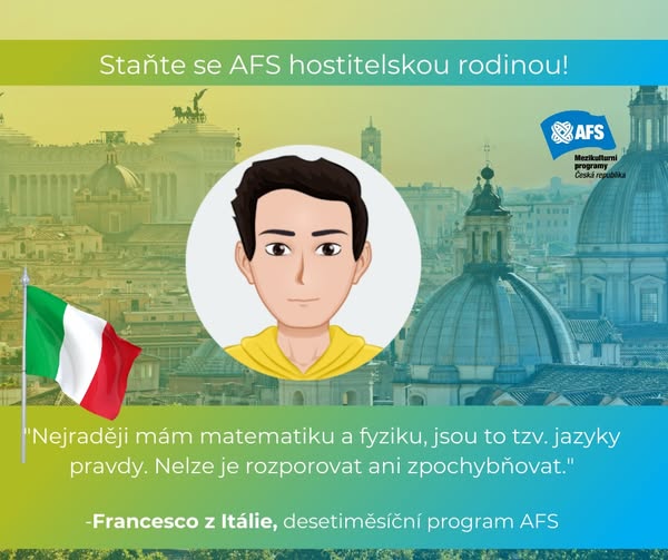 Mám rád, jak AFS spojuje lidi a kultury. Každý student, který vycestuje, mění svět k lepšímu! 💪✨detail |