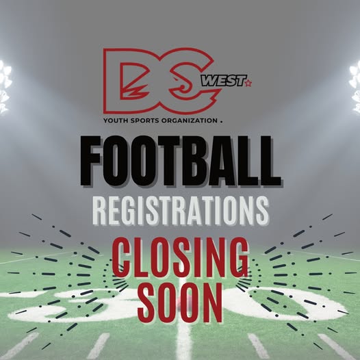DCWYSO registration for the 2025 Flag and Tackle Football Season will close 6/23. EARLY BIRD DISCOUNT ENDS TODAY (6/16)! REGISTER NOW: By visiting our website at www.dcwestyouthsports.org *Early Bird Registration will be open through June 16th and then Early Bird pricing will disappear! Late Registration will close June 23rd spots are not guaranteed thereafter. **NOTE: Sign your player up for the grade they will be in for the fall of 2025. (fb)