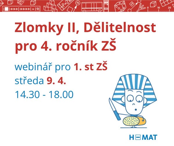 Jak využít svačinu k výuce matematiky? Učíte zlomky na koláči, pizze nebo čokoládě? A co takhle na chlebu? Pomocí egyptského dělení chleba žáci získají zkušenost s kmenovými zlomky a seznámí se s klíčovými matematickými principy. Kromě zlomků se zaměříme i na dělitelnost. Vyzkoušíme si tvorbu gradovaných úloh v prostředí Pavučiny a Kmeny, aby úlohy představovaly přiměřenou výzvu jak pro slabší žáky, tak pro ty nejzdatnější. Více naleznete zde: https://seminare.h-mat.cz/seminar/webinar-pro-1-stupen-zs-4-x-45-min-13681 (fb)