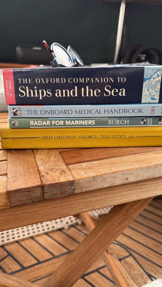A few of the books onboard. When stacked like this they make a nice laptop stand for attending meetings. (fb)