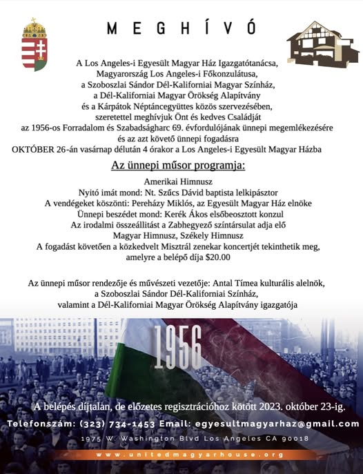 Szeretettel várunk minden kedves honfitársunkat az 1956-os forradalom és szabadságharc tiszteletére rendezett ünnepi megemlékezésre és fogadásra a Los Angeles-i Egyesült Magyar Házban, október 26-án 4:00 órai kezdettel. A megemlékezést követően a közkedvelt Misztrál zenekar koncertjére invitáljuk Önöket. További részletek a mellékletben. (fb)