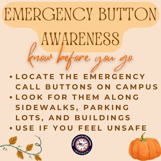 NCCSAFE’s next tip is to know before you go. Knowing where to find help can make all the difference. Take a moment to locate emergency call buttons on campus before you go and use in any instance where you feel unsafe. #KnowBeforeYouGo #fallsafety #nccsafe (fb)