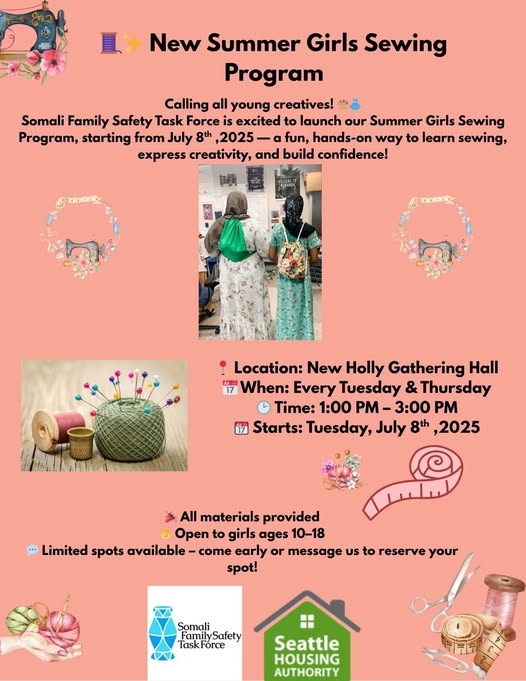 🧵✨ New Summer Girls Sewing Program – Starts Tomorrow! ✨🧵 Calling all young creatives! 🎨👗 We’re excited to launch our Summer Girls Sewing Program, starting TOMORROW — a fun, hands-on way to learn sewing, express creativity, and build confidence! 📍 Location: New Holly Gathering Hall 📅 When: Every Tuesday & Thursday 🕑 Time: 1:00 PM – 3:00 PM 📆 Starts: Tuesday, July 1st Whether you're brand new to sewing or already have some skills, this is a great opportunity to learn, make friends, and create beautiful projects together! 💜✂️ 🎉 All materials provided 🧒 Open to girls ages 10–17 💬 Limited spots available – come early or message us to reserve your spot! Let’s stitch something beautiful this summer! 🌼🪡 #sewing #SewingProgram #somalifamilysafetytaskforce #summer2025 (fb)