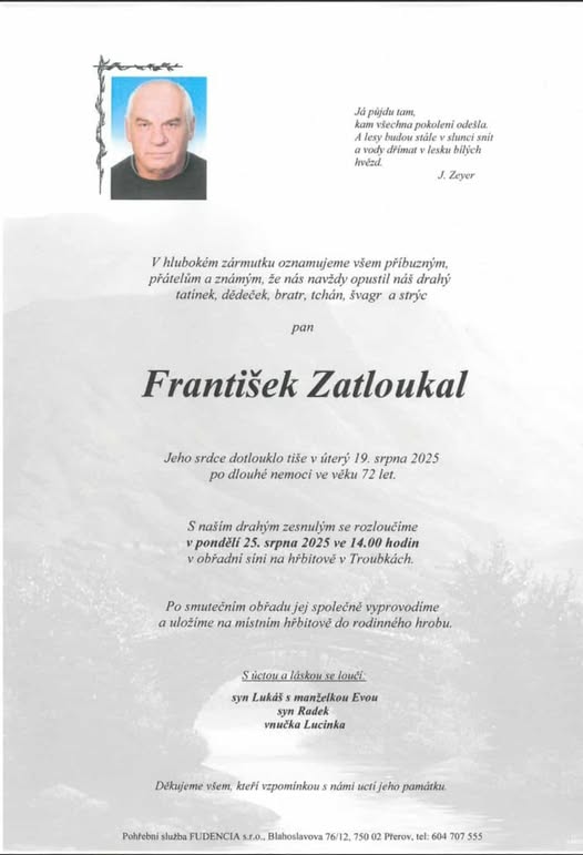 V úterý 19. srpna přišel náš sbor o dlouholetého člena Františka Zatloukala. Děkujeme za mnoho let které věnoval dobrovolně hasičině. Upřímnou soustrast rodině.🕯️🖤 Troubečtí hasiči. (fb)