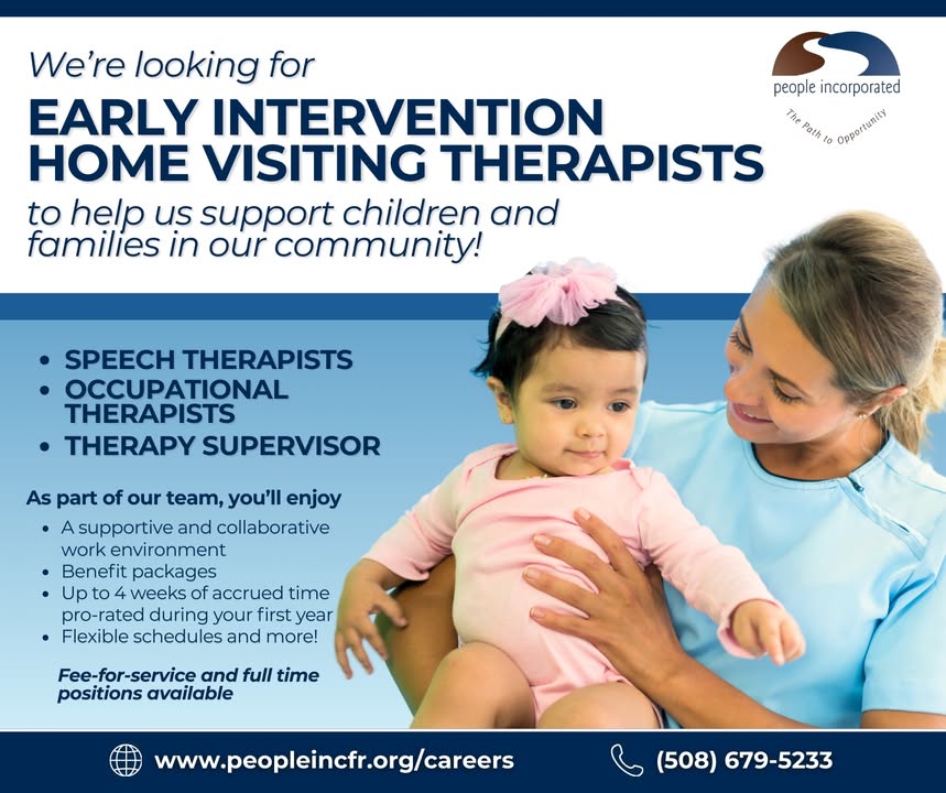 🌟 𝗪𝗲'𝗿𝗲 𝗛𝗶𝗿𝗶𝗻𝗴 𝗘𝗮𝗿𝗹𝘆 𝗜𝗻𝘁𝗲𝗿𝘃𝗲𝗻𝘁𝗶𝗼𝗻 𝗛𝗼𝗺𝗲 𝗩𝗶𝘀𝗶𝘁𝗶𝗻𝗴 𝗧𝗵𝗲𝗿𝗮𝗽𝗶𝘀𝘁𝘀!🌟 Looking for a meaningful career where you can help children thrive right in their own homes? Join the team at People Incorporated and make a lasting impact in your community! 𝗪𝗲’𝗿𝗲 𝗹𝗼𝗼𝗸𝗶𝗻𝗴 𝗳𝗼𝗿: ✔️ 𝗦𝗽𝗲𝗲𝗰𝗵 𝗧𝗵𝗲𝗿𝗮𝗽𝗶𝘀𝘁𝘀 ✔️ 𝗢𝗰𝗰𝘂𝗽𝗮𝘁𝗶𝗼𝗻𝗮𝗹 𝗧𝗵𝗲𝗿𝗮𝗽𝗶𝘀𝘁𝘀 ✔️ 𝗧𝗵𝗲𝗿𝗮𝗽𝘆 𝗦𝘂𝗽𝗲𝗿𝘃𝗶𝘀𝗼𝗿 Enjoy a supportive work environment, flexible schedules, great benefits, and up to 4 weeks of accrued time off during your first year! 📍 Fee-for-service and full-time positions available. 📞 Have questions? Call us at (508) 679-5233 🔗 Learn more and apply today: 👇 peopleincfr.org/careers/childrensserviceshiring/#childrensservicesearlyintervention #NowHiring #TherapistJobs #EarlyIntervention #OccupationalTherapy #SpeechTherapy #CareersWithPurpose #PeopleIncorporated (fb)