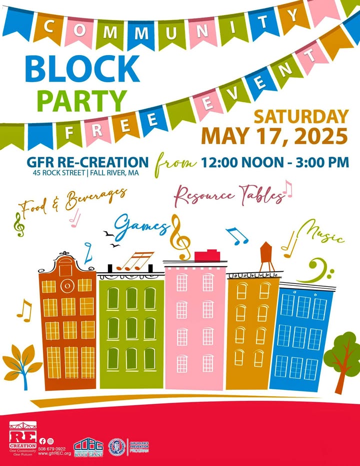 Mark your calendars for the 4th Annual Community Block Party hosted by Greater Fall River RE-CREATION! 📅 Saturday, May 17, 2025 🕛 12:00 PM – 3:00 PM 📍 Greater Fall River RE-CREATION – 45 Rock Street, Fall River, MA This is a FREE outdoor event that is open to the public. Stop by for an afternoon full of fun, including: 🎨 Face Painting 🧗♀️ Rock Wall 🎈 Balloon & Spray Paint Art 🎁 Free Giveaways 📚 Resource Tables 🎧 DJ with live music 🍔 Free Food & Refreshments ...and more! 🚗 Public parking on Troy Street 📞 For details, contact Greater Fall River RE-CREATION at (508) 679-0922 🌐 Learn more at www.gfrrec.org #FallRiverEvents #CommunityBlockParty #FamilyFun #FreeEvent #GreaterFallRiverRECREATION (fb)