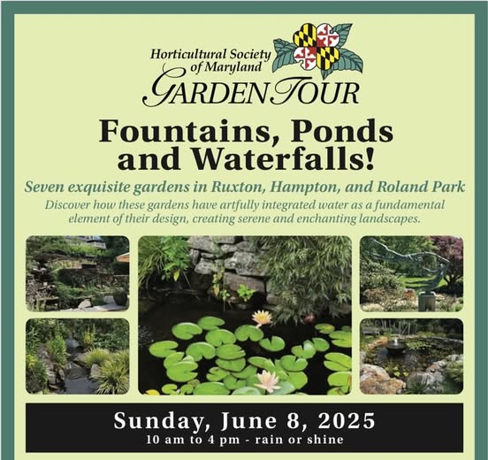 The 2025 HSM Garden Tour is back with a splash! Fountains, Ponds, and Waterfalls: Seven exquisite gardens in Ruxton, Hampton, and Roland Park. Discover how these gardens have artfully integrated water as a fundamental element of their design, creating serene and enchanting landscapes. Sunday, June 8, 10am-4pm, rain or shine. Tickets may be purchased on the day of the tour at Green Fields Nursery, 5424 Falls Rd. Members admitted free. Non- members tickets are $40 if purchased in advance by Friday June 6th. $45 on the day of the event. For more information go to: www.mdhorticulture.org Thank you to our wonderful sponsors: @maxalea_inc @brandywinecottage.shop @foxborough_inc Gibson Landscapes @greenfieldsnursery Grabowski Design @chesapeakeirrigationlighting @hallowedgroundgarden @pinehurstlandscapes Harvest Moon Landscaping @putnamhillnursery @livegreenlandscapes @whitehousenurserymd @daveytree A & A Tree Experts, Inc. Eliasberg Family Foundation, Inc. (fb)