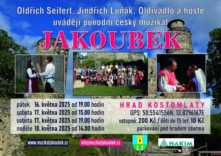 Vážení přátelé a fanoušci muzikálu Jakoubek, je to tu :) Termíny muzikálu Jakoubek: Pátek 16.5. 2025 od 19.00 hodin Sobota 17.5. 2025 od 15.00 hod. a 19.00 hodin Neděle 18.5. 2025 od 14.00 hodin Pozor, vstupenky lze koupit jen na místě, žádná rezervace ani předprodej nebude!!! Ale nebojte se, všichni se vejdete :) Těšíme se na vás :) (fb)