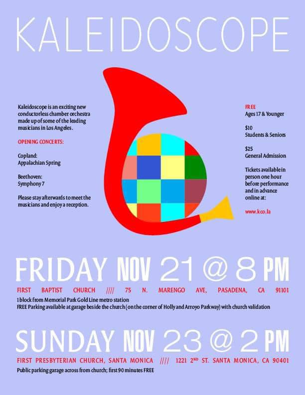 Los Angeles based conductorless orchestra, founded in 2014. Featured in LA Times, Washington Post, Huffington Post, Musical America, and Symphony Magazine. More info on our website at: www.kco.la Kaleidoscope is a conductorless orchestra dedicated to enriching lives through exhilarating concert experience, artistic excellence, musician leadership, and connecting with the diverse communities of Los Angeles.