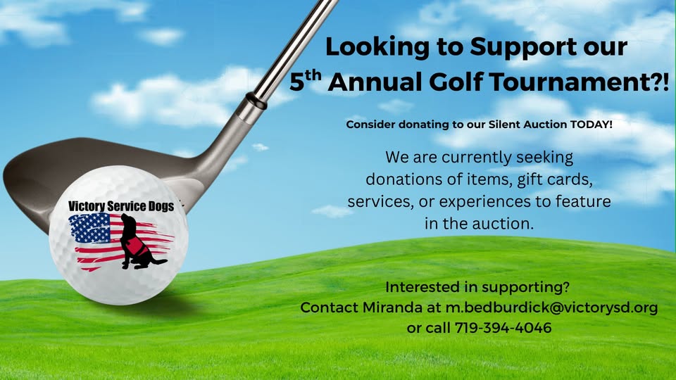 We’re gearing up for our 5th Annual VSD Golf Tournament ⛳ and we need your help to make our Silent Auction a success! Do you or your business have something to contribute? From gift baskets and gift cards to unique experiences or services, no item is too big or small. Your generosity helps support veterans and first responders through our life-changing service dog programs 🐾🇺🇸 Deadline for item donations: August 15th Interested in contributing? Contact Miranda at m.bedburdick@victorysd.org Or call us at 719-394-4046 We’re incredibly grateful for our community partners who make this event possible. Thank you for being a part of the mission! If you are interested in golfing, we still have sponsorship available: https://tinyurl.com/49hyynvu Eisenhower Golf Course, USAF Academy Friday, September 5th, 2025 Check-In: 12:00 PM | Shotgun Start: 1:30 PM (fb)