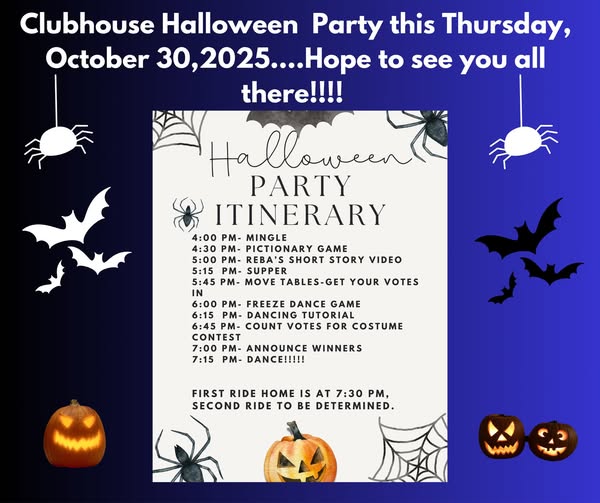 🎃Clubhouse Members: Join us this afternoon for our Halloween party at the Clubhouse! The fun starts at 4:00pm! 👻🕷🦇 (fb)
