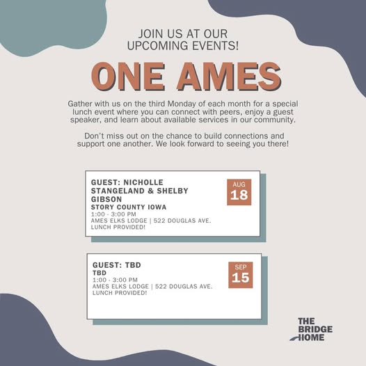 🌟 Join Us Next Week for OneAmes! 🌟 Mark your calendars for August 18th! We’re excited to invite you to OneAmes featuring Nicholle Stangeland and Shelby Gibson with Story County, Iowa. The Bridge Home partners with Ames Elks Lodge 1626-Official to host this event on the third Monday of every month! We’ll also have a table where you can register with our housing team and access resources! Lunch will be provided, so come hungry and ready to learn! We are in need of an organization to present in September. If you are interested, please reach out to us! We can’t wait to see you there! 🍽️✨ (fb)