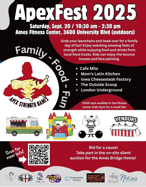🎉 ApexFest 2025 on Saturday, September 20th! 🎉 Join us from 10:30 AM to 2:30 PM at the Ames Fitness Center for the ApexFest 2025 Strongman Competition presented by Strongman Fitness Ames and hosted by Ames Fitness Center South! We’re honored that The Bridge Home has been chosen as the recipient of the event proceeds, which will support family units at our new campus. This event is a fantastic opportunity for us to share more about The Bridge Home with our community. Watch competitors lift, carry, and battle for the title in this exciting event. It’s family-friendly, so bring the kids to join the fun with bouncy houses and face painting. Enjoy delicious food and drinks from favorites like Café Milo, Mom's Latin Kitchen, Iowa Cheese Steak Factory, Outside Scoop Ankeny, and London Underground! ApexFest just keeps growing and it's been awesome to have all the support. Huge thank you to the sponsors who have helped us grow this event in our community: IRON APE , Studio7 Salon and Spa , Ames Fitness Center , NuCara , THR' IV, Community Choice Credit Union , Complete Connection, @515fitnessjosh, Frank D Mirano , @WittrockSolutions, @VideoUnlimited Scan the code on the flyer to find out more, we can't wait to see you there! (fb)