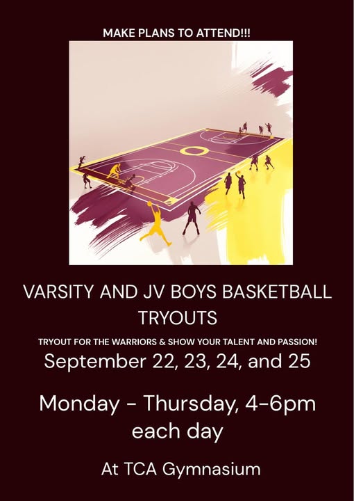 It’s a few months away, but it will be here before you know it. We are expecting a large number of young men who want to play basketball this year. If your son is planning to play basketball this season, he’ll need to be present during these tryouts. Enjoy your summer break! Go Warriors! (fb)