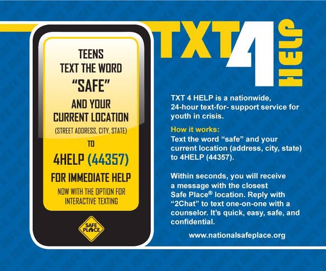 A vital youth crisis support service provided by National Safe Place Network, TXT 4 HELP is a NATIONWIDE, 24hr text-for-support service for teens in crisis. TXT 4 HELP can be used for the same reason a young person may go to a Safe Place site - abuse, bullying, family problems, depression, self-harm or suicidal thoughts, and more. TXT 4 HELP counselors can provide support via text and can offer access to immediate help regardless of where youth are. As the Safe Place Agency for Horry and surrounding counties, we are proud to provide this same youth crisis support in our own community. Our Crisis Center staff here at Sea Haven for Youth are available via 24hr Crisis Hotline: 844-394-6414. (fb)