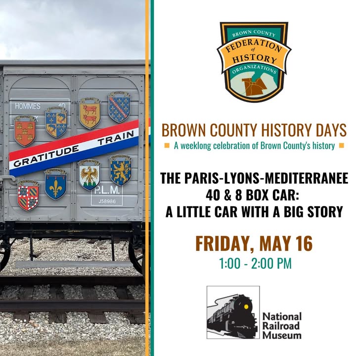 Did you miss our Brown County History Day program? Don't worry, you have one more chance! Join us at the National Railroad Museum on Friday, May 16, from 1–2 p.m. as we explore the 40&8 Box Car! The 40&8 Box Car is a symbol of resilience, sacrifice, and international gratitude. Learn how it served in two World Wars and became a gift from the people of France to the United States after WWII. Admission is free! More details at: https://browncountywihistory.com/historydays/ (fb)