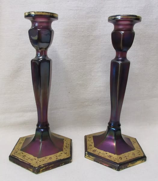 just acquired these Wistaria Fenton Candleholders with gold decoration. I don't believe I have seen the Wistaria ones with the gold decoration. We find ruby, topaz, blue colored ones from time to time. Maybe there are other colors with the gold decoration? if you have other colors please share them. (fb)