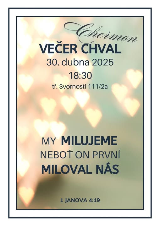 Srdečně vás zveme na VEČER CHVAL 🎶 Každý večer chval je něčím výjimečný. Tento povede skupina CHERMON, která hrála i na Velikonoční bohoslužbě ~ Těšíme se na vás 💛 (fb)