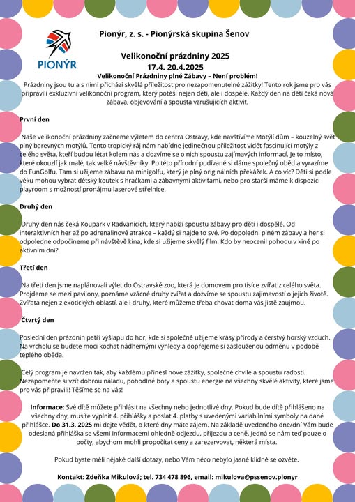[1] https://www.dnb.com/business-directory/company-profiles.pion%C3%BDr_z_s_-_pion%C3%BDrsk%C3%A1_skupina__%C5%A1enov.9a890378f63733c8d1438e15c91c292a.html [2] https://pionyr.cz/kontakty/pionyrske-skupiny/ [3] https://pssenov.pionyr.cz/beta/dokumenty/2020/Podzimky/Podzimky_2020_bezinfekcnost.pdf [4] https://pionyr.cz [5] https://ares.gov.cz/ekonomicke-subjekty/res/68158017