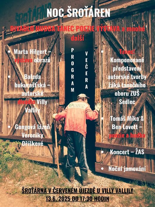 Zveme Vás na historicky první NOC ŠROŤÁREN 😊 KDE: Ve Šroťárně na Karlově náměstí u Villy Vallily v Červeném Újezdě u Votic 🏡 KDY: v pátek 13.6.2025 od 17:30 hodin 🌅 Hudební nástroje pro noční jamování s sebou! Těšíme se na viděnou. (fb)