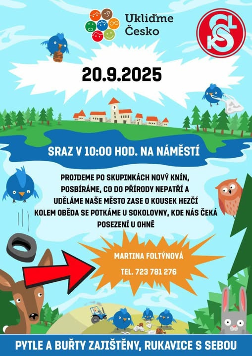 🌍 Ukliďme Česko – Nový Knín 🌍 Přidejte se k nám na společnou akci, kde uděláme něco dobrého pro naši přírodu i město! 💚 📅 Kdy? 20. září 2025 🕙 V kolik? Sraz v 10:00 na náměstí 📍 Kde? Nový Knín Rozdělíme se do skupinek a projdeme město i okolí. Posbíráme, co do přírody nepatří, a uděláme Nový Knín zase o kousek krásnější! 🧹🍃 🔥 Po práci se potkáme u sokolovny, kde nás čeká posezení u ohně – buřty zajištěny! 😊 🧤 S sebou jen rukavice, pytle i občerstvení jsou zajištěny. 📞 V případě dotazů kontaktujte: Martina Foltýnová – 723 781 276 Pojďme do toho společně – pro sebe, pro přírodu, pro naše město! 💪🌲 (fb)