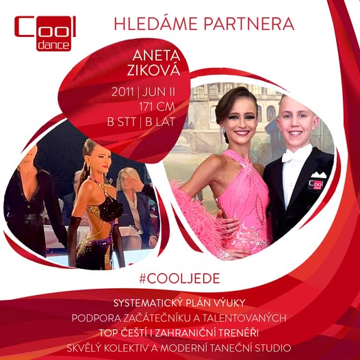 Hledáme partnera pro Anetku! Ahoj jmenuji se Aneta a jsem ročník 2011, kategorie Junior II. Měřím 171 cm a mám třídy B STT a B LAT. Pravidelné tréninky 3x-4x týdně, individuální lekce, soustředění, zahraniční trenéři a soutěže jsou samozřejmostí. Trénuji v Praze v tanečním klubu COOL DANCE, kde mám výborné zázemí. V případě zájmu nás neváhejte kontaktovat zde na facebooku nebo klub@cooldance.cz. (fb)