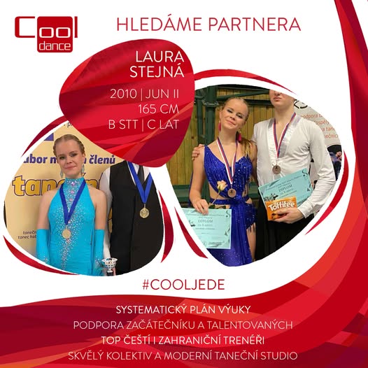 Hledáme partnera pro Lauru! Ahoj jmenuji se Laura a jsem ročník 2010, kategorie Junior II. Měřím 165 cm a mám třídy B STT a C LAT. Pravidelné tréninky 4x-5x týdně, individuální lekce, soustředění, zahraniční trenéři a soutěže jsou samozřejmostí. Trénuji v Praze v tanečním klubu COOL DANCE, kde mám výborné zázemí. V případě zájmu nás neváhejte kontaktovat zde na facebooku nebo klub@cooldance.cz. (fb)