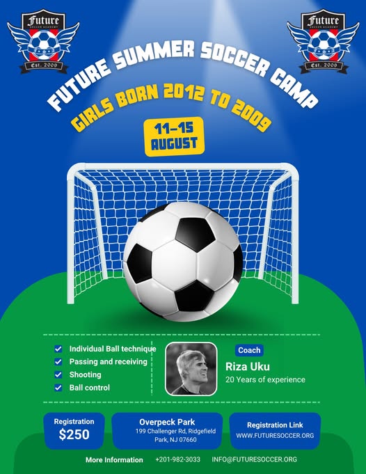 🚨 ONE-WEEK GIRLS SUMMER SOCCER CAMP! 🚨 Future Soccer Academy is excited to announce a special summer camp exclusively for girls born between 2012 and 2009! This one-week camp will be led by our Club Director Coach Riza Uku, who brings over 20 years of coaching and playing experience. It’s a great opportunity to prepare for fall tryouts with focused technical training and expert instruction. 📍 Location: Overpeck Park, Ridgefield Park, NJ 07660 📅 Dates: Monday, August 11 – Friday, August 15 ⏰ Time: 8:00 AM – 11:00 AM 💵 Fee: $250 per player 🎯 Limited spots available – don’t miss this rare opportunity to train with one of the best! 👉 Register here: https://www.futuresoccer.org/Default.aspx?tabid=1462487 For questions, feel free to contact us at 📧 info@futuresoccer.org or 📞 (201) 982-3033. #FutureSoccerAcademy #GirlsSoccerCamp #NJYouthSoccer #SoccerTraining #OverpeckPark #TrainWithFuture (fb)