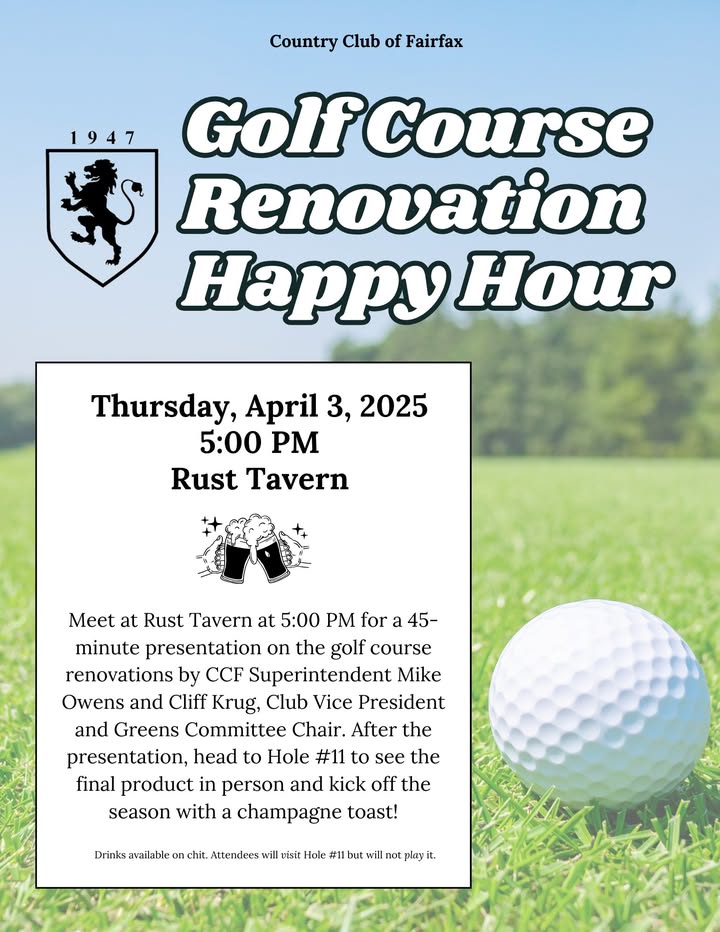 Join us for a special Golf Course Renovation Happy Hour on Thursday, April 3 at 5:00 PM! 🍻⛳️ Hear from CCF Superintendent Mike Owens and Club VP Cliff Krug about the exciting updates, then visit the brand-new Hole #11 for a champagne toast. 🥂 Plus, attendees will have the chance to enter a raffle to be the FIRST to play the newly renovated hole! See you there! (fb)