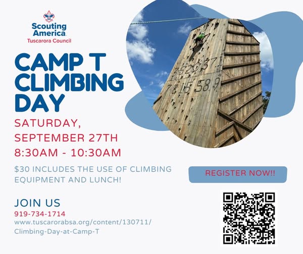 Open to Scout BSA youth age 13 and older. You don't need any prior experience. Registration deadline is September 19th, 2025. Time is running out! #climbingmeritbadge #ScoutingAmerica #ThisIsScouting #councilcamporee #FallCamporee #tuscaroracouncilbsa #tuscaroracouncil #camptuscarora https://www.tuscarorabsa.org/content/130711/Climbing-Day-at-Camp-T (fb)